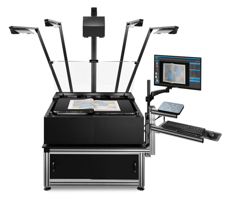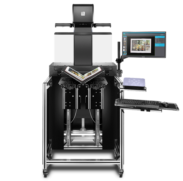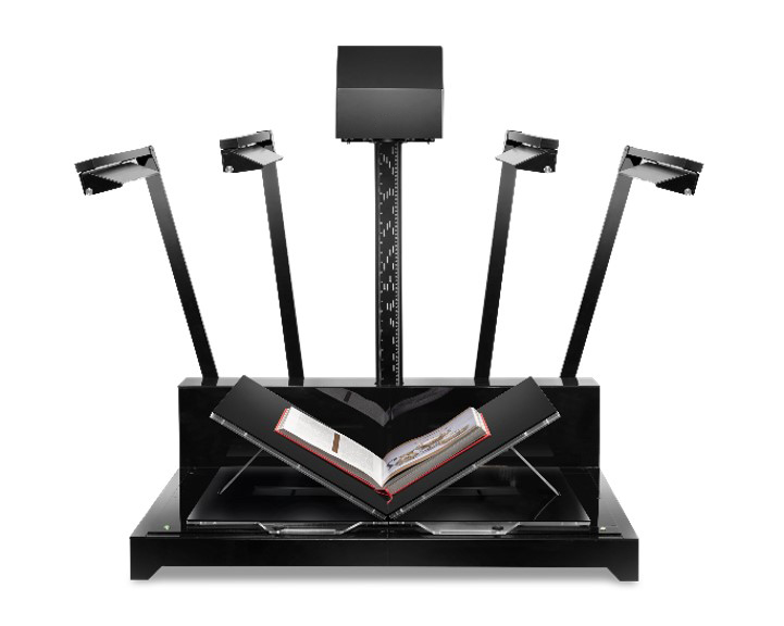 Escáner planetario universal con vidrio plano integrado y base automatizada reforzada para originales de hasta 50 cm de grosor y hasta 50 kg de peso